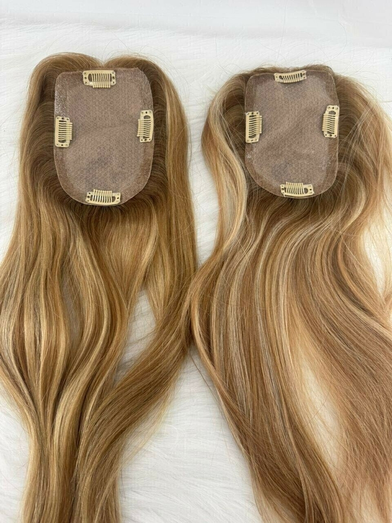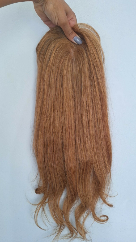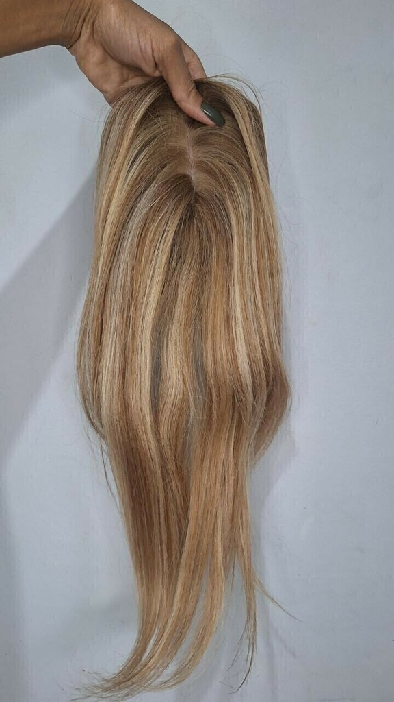 Topo de cabeça de cabelo natural loiro. Três opções de base 13 x 14 ou 9 x 14 e 15 x 16 cm. Para disfarçar falhas, alopecia ou quedas severas de cabelo. Ideal para quem está passando por tratamentos como quimioterapia ou algum outro problema de queda de cabelo.
